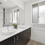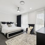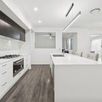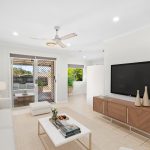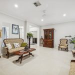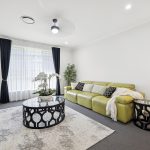 The kitchen, equipped with a sleek stone benchtop and ample cabinetry, offers both functionality and style. Its layout is ideal for those who enjoy cooking and entertaining, as it seamlessly flows into the dining area, making meal preparation and serving more efficient. This design also creates a visual connection to the outdoor alfresco space, perfect for hosting gatherings or enjoying casual family dinners.
