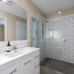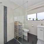 The main bathroom serving the home is a true showpiece, featuring grey floor-to-ceiling tiles and a stylish vanity. The backlit mirror enhances the modern feel of the space, adding to the overall sleek and sophisticated design. The bathroom also includes a large walk-in shower and a separate toilet for added convenience.