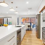 Beyond the refined exterior, a sprawling single-level floorplan is introduced by a striking hall with 8.6ft tall ceilings. Three separate living areas, each with external access, include a lounge, a rumpus, and a central family and dining room complemented by a wood heater and a gourmet chef’s kitchen. Here, cooking and socialising will be a breeze thanks to its stunning design, showcasing a 900mm stainless steel upright cooker, a dishwasher, twin double-door pantries and an enormous 40mm stone-wrapped breakfast island with double-sided storage. These areas connect to a series of outdoor spaces that provide all-seasons entertaining potential. The expansive covered alfresco with lighting, an open fireplace and PVC blinds will be the family’s favourite gathering point, while the covered rear verandah with a serene treetop outlook provides the perfect spot to unwind. Between them rests a solar-heated swimming pool, offering endless summer fun.