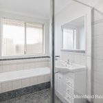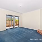Sliding doors from the dining area open to a lovely extended patio, with paving and a high gabled roof. Following the patio down the length of the house, we find another door that leads into the laundry, and beyond that is the tidy, reticulated lawn and gardens.