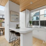 Step inside to a light-filled, spacious living area with a high ceiling leading through to a charming kitchen and dining space. The kitchen features stainless steel appliances, including a dishwasher.