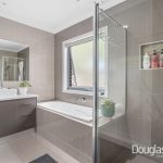 Upstairs, natural light floods a generous landing leading to two oversized, opulent bedrooms, each equipped with split system air conditioning/heating. One bedroom features a generous walk-in robe and standalone bathtub, while the other offers a full set built-in wardrobe. Both ensuite bathrooms showcase stone vanities, toilets, and oversized semi-frameless glass showers, adorned with magnificent porcelain tiles. Luxurious plush carpeting throughout the upper level adds to the indulgent ambiance.